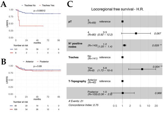 Kaplan–Meier curves for LRRFS according to the tracheal involvement (A) and T-topography (B). Forest plot of LRRFS multivariable model (C).