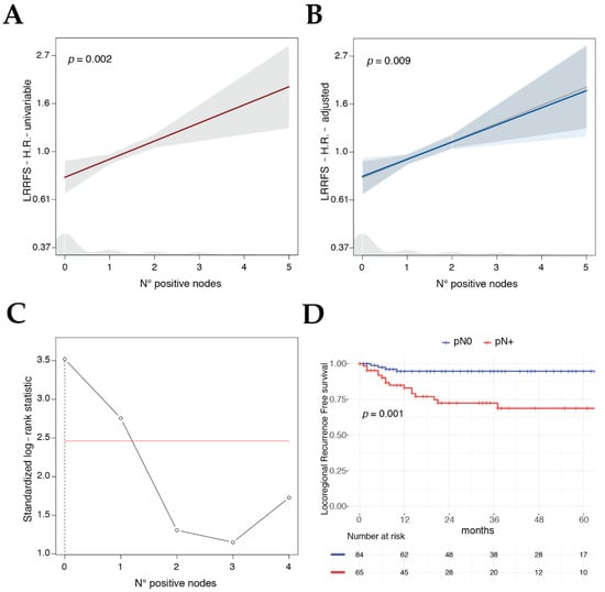 The prognostic clinical relevance of the number of positive lymph nodes for LRRFS was consistent and stable considering it alone in a univariable model (Figure 5A), and after adjusting its effect (estimated by the HR) with the covariates included in the LRRFS multivariable model (Figure 5B). Identification of the total number of positive lymph nodes as one of the main prognostic features associated with loco-regional failure raised the question of if an optimal cut-off for this variable could be identified to better predict the ensuing outcomes in a dichotomic fashion. Applying the maximally selected log-rank statistics, a robust method that takes into account the multiplicity of tests, the best cut-off was zero positive nodes (p = 0.001, Figure 5C), splitting up pN0 vs. pN+ patients and confirming the relevance of this biologic and easy to measure feature (Figure 5D).