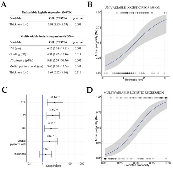 As the presence of metastatic lymph nodes was one of the main factors associated with loco-regional failure, histopathologic TT, available for 102 (68%) patients of the cohort, was investigated by logistic regression models for the prediction of the binary outcome pN0 vs. pN+. The univariable logistic model including just TT showed a significant association of this covariate with the presence of metastatic lymph nodes (OR 3.94, p = 0.001; Figure 6A,B). All available potential predictors, the covariates included in the survival analysis, were investigated in a multivariable logistic regression; the best model was built by a stepwise variable selection, keeping the TT inside the model as investigative variable (Figure 6A). Tumor category T4a (OR 8.44, p = 0.002), poor differentiation (OR 4.51, p = 0.011), presence of LVI (OR 6.15, p = 0.001), and involvement of the medial wall of the piriform sinus (OR 3.63, p = 0.041) were significantly and independently associated with the presence of lymph node metastases (Figure 6A,C,D), whereas TT in the multivariable model lost its association with the binary outcome N0 vs. N+ (p = 0.316) (Figure 6A,C).