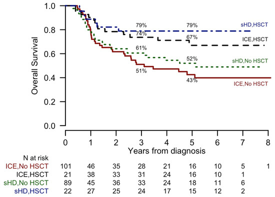 Kaplan-Meier curves of Overall Survival (OS), according to induction and consolidation treatments, in complete remission patients. 5-year OS estimates are reported. p values assessed comparing groups are: HSCT, sHD vs. ICE: p = 0.48; No HSCT, sHD vs. ICE: p = 0.52; sHD, HSCT vs. no HSCT: p = 0.03; ICE, HSCT vs. no HSCT: p = 0.01.