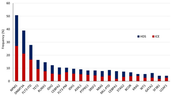 In this context, the purpose of this study was to define the association of molecular mutations with the outcome of a cohort of 221 NK-AML patients treated according to a prospective trial comparing a standard vs. high-dose chemotherapy regimen for remission induction (ClinicalTrials.gov identifier: NCT00495287) [12].