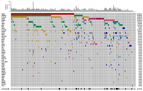 As expected, the most frequently mutated gene in our cohort of patients was NPM1, followed by DNMT3A and FLT3. We noticed that DNMT3A, FLT3, IDH1, PTPN11, and RAD21 mutations were more common in the NPM1 mutated patients (p < 0.05). In particular, IDH1 R132H mutation was strictly associated with NPM1 mutation and mutually exclusive with RUNX1 and ASXL1 while the R132C was not [13]. Alterations involving the IDH2 gene in specific amino-acids showed a different behavior regarding co-occurrence with other genes lesions. Particularly, IDH2 R140 mutation was associated with the presence of NPM1 alteration and rarely with RUNX1 mutations, while the amino-acid changes involving R172 presented the opposite combinations [14]. As expected, RUNX1 mutations often co-occurred with alterations in ASXL1, BCOR, SF3B1, SRSF2, STAG2, NRAS, and KMT2A-PTD [15], and within this latter group of genes, pathologic variants were also frequently present in combination (Figure 4). BCOR mutations were virtually mutually exclusive with NPM1 mutations while associated with RUNX1 alterations [16]. Lastly, TP53 mutations were revealed only in one NK-AML patient as solely identified genetic aberration (Figure 3). Interestingly, this patient harbored two point mutations probably affecting two different alleles, as commonly described for tumor suppressor genes.