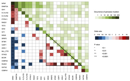 Pairwise association among gene mutations. The odds ratio of the association is color coded: blue colors indicate a negative association while red colors indicate a positive association. In addition, differential green intensity represent a different co-occurrence of mutations in terms of number of patients. Triangle indicates a group of genes which frequently co-mutate in NPM1 wild-type AML. CEBPA2 and CEBPA1 indicate the presence of double or single mutation, respectively.