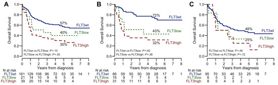 Kaplan-Meier curves of Overall Survival (OS), according to FLT3-ITD ratio. (A) All patients; (B) NPM1 positive patients; (C) NPM1 wild-type patients. 5-year OS estimates and p values are reported.
