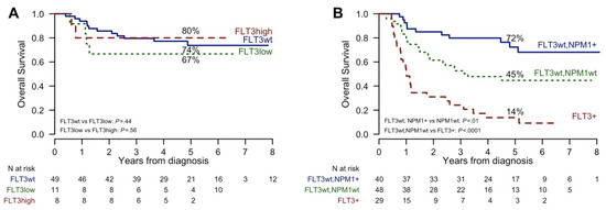 - Thiede, C.; Steudel, C.; Mohr, B.; Schaich, M.; Schäkel, U.; Platzbecker, U.; Wermke, M.; Bornhäuser, M.; Ritter, M.; Neubauer, A.; et al. Analysis of FLT3-activating mutations in 979 patients with acute myelogenous leukemia: Association with FAB subtypes and identification of subgroups with poor prognosis. Blood 2002, 99, 4326–4335. [Google Scholar] [CrossRef]
