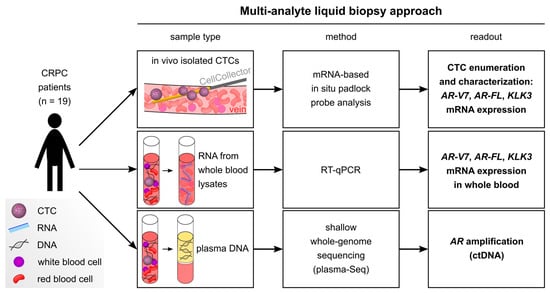 Overview of our multi-analyte liquid biopsy approach which combines enumeration and characterization of in vivo isolated circulating tumor cells (CTCs), mRNA expression analysis in whole blood lysates, and detection of focal AR (androgen receptor) amplification in circulating tumor DNA (ctDNA). KLK3: kallikrein-related peptidase 3; CRPC: castration-resistant prostate cancer.