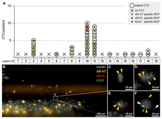 In situ detection of AR-V7, AR-FL, and KLK3 transcripts in CTCs of castration-resistant prostate cancer (CRPC) patients. (A) For each patient, the number and expression profile of CTCs is visualized. CTCs are represented by black circles. RCPs specific for AR-V7, AR-FL, and KLK3 are visualized as yellow, red, and green spots, respectively. Based on the background in healthy controls, only cells with ≥1 KLK3 RCPs/cell, ≥2 AR-V7 RCPs/cell or ≥3 AR-FL RCPs/cell were rated as CTCs. (B) Overview of in-situ-analyzed cells on a CellCollector (patient 16). DAPI-stained nuclei are shown in gray. Scale bar = 100 μm. Representative CTCs from patients 15 (C), 6 (D), 16 (E), and 11 (F) are depicted in more detail. Scale bar = 10 μm. AR-V7-, AR-FL-, and KLK3-specific RCPs appear as yellow, red, and green spots, respectively, and are marked by arrowheads. White arrowheads indicate unspecific staining patterns (fluorescent in all channels or signals outside a cell).
