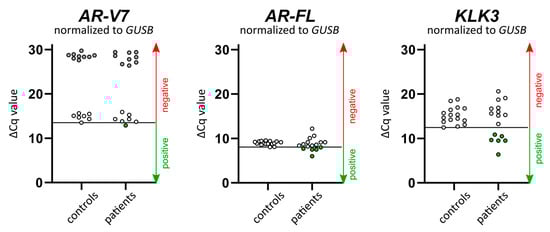Sixteen patient samples and 16 samples of healthy (negative) controls were analyzed by probe-based gene expression assays. Cycle of quantification (Cq) values of AR-V7, AR-FL, and KLK3 were normalized to GUSB, yielding the respective relative ΔCq values. Technical replicates were averaged (mean) and lowest mean ΔCq value among the negative control samples was set as threshold for positivity as previously described in Todenhöfer et al. []. GraphPad Prism version 8.4.1 was used for descriptive statistics and data visualization.