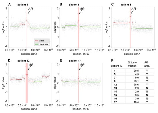 In a subset of ten patients, we had access to corresponding plasma samples, which were analyzed by sWGS, i.e., plasma-Seq [], to call for focal AR amplifications and to quantify tumor content in cell-free DNA using the probabilistic ichorCNA model []. Although ichorCNA tumor fractions were below the quantitative threshold of 3% in 30% of the patients (3/10), AR amplicons were identified in 50% of the patients (5/10), which is in range with previous findings in advanced PC [,]. Representative plots of focal AR amplifications are depicted in Figure 4.