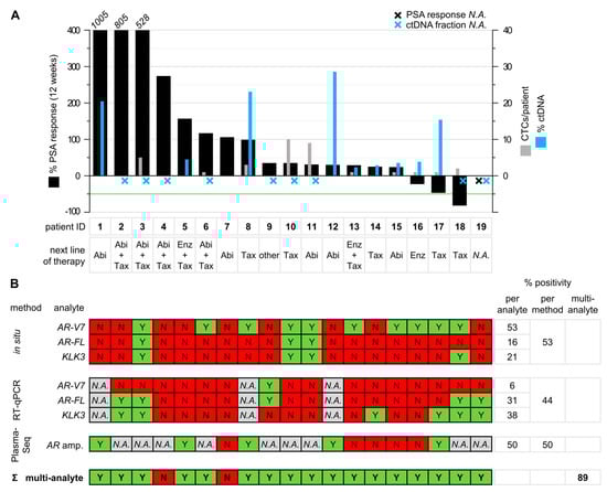 Prostate specific antigen (PSA) response and summary of multi-analyte liquid biopsy approach. (A) The waterfall plot depicts best PSA response after 12 weeks (primary y-axis). PSA50 response (indicated by the green line) was only reached by one patient. The primary y-axis is cropped at 400%. Values above 400% are printed above the respective bars (patients 1, 2, and 3). The secondary y-axis shows the number of CTCs detected by in situ padlock probe analysis (grey) and the fraction of ctDNA determined by the ichorCNA algorithm (blue). Patient IDs and the next line of therapy are indicated below the bar chart. Abi = abiraterone, Enz = enzalutamide, Tax = taxanes, N.A. = not available. (B) Summary of positive (Y, green) and negative (N, red) test results of all liquid biopsy analyses for patients 1–19. On the right, the percentage of positive results for each single analyte and the cumulative percentage of positive results across all assays of a given method were calculated. The sensitivity for tumor-related information could be increased by combining all liquid biopsy approaches, resulting in an overall positivity of 89% for the multi-analyte approach (summarized at the bottom). ctDNA: circulating tumor DNA.