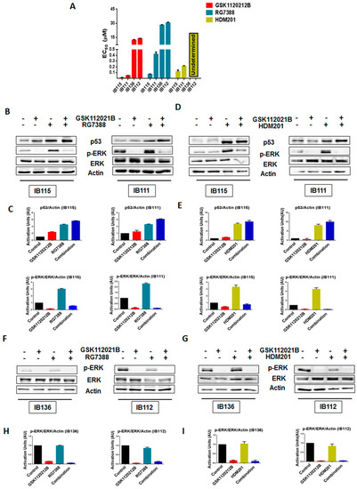 The following are available online at https://www.mdpi.com/2072-6694/12/8/2253/s1, Figure S1: Immunoprecipitation (IP) analysis revealed no direct physical interaction between p53 and p-ERK. Full blots of all immunoblots, Table S1: EC50 values for GSK112021B, RG7388, and HDM201 in p53 wild-type cells (IB115 and IB111) and p53-null cells (IB136 and IB112).