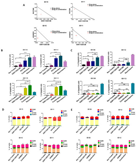 MDM2 antagonists synergize with a MEK inhibitor in p53 wild-type cells. (A) Isobolograms showing the synergistic effect of RG7388 and HDM201 with GSK112021B in p53 wild-type cells (IB115 and IB111). Effect of GSK112021B, RG7388, and HDM201, alone or in combination, on apoptosis in p53 wild-type cells (IB115 and IB111) (B) and p53-null cells (IB136 and IB112) (C) Effect of GSK112021B, RG7388, and HDM201, alone or in combination, on cell cycle in p53 wild-type cells (IB115 and IB111) (D) and p53-null cells (IB136 and IB112) (E) * p ≤ 0.05, ** p ≤ 0.01, *** p ≤ 0.001, **** p ≤ 0.0001, and ns (non-significant). Data shown represent the results of three independent experiments.