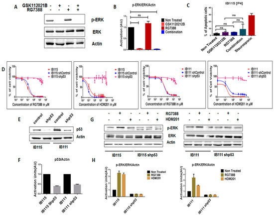 We then investigated the impact of shRNA-mediated p53 silencing on IB115 and IB111 cells (Figure 3E,F). Using a cell viability assay, we observed that p53-silenced cells became resistant to MDM2 antagonists (Figure 3D). Moreover, they did not induce any upregulation of p-ERK, as observed in non-transfected cells (Figure 3G,H). These results confirmed our prediction that intact p53 is essential for MDM2 antagonist-induced activation of MEK/ERK signaling in DDLPS.