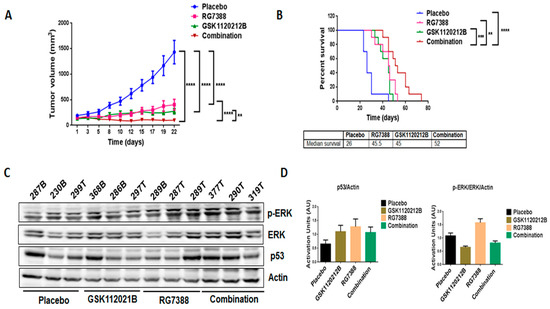 Combination treatment of GSK1120212B and RG7388 resulted in decreased tumor volume and increased survival of mice. (A) Effect of GSK112021B and RG7388, alone or in combination, on tumor growth. (B) Kaplan–Meier curve depicting overall survival of mice treated with GSK1120212B and/or RG7388. (C) Representative blots of tumor tissues from mice treated with GSK112021B, RG7388, or the combination and immunoblotted for p-ERK, ERK, and p53. (D) Quantification of blots of tumor tissues from mice treated with GSK112021B, RG7388, or the combination. ** p ≤ 0.01, *** p ≤ 0.001, and **** p ≤ 0.0001.