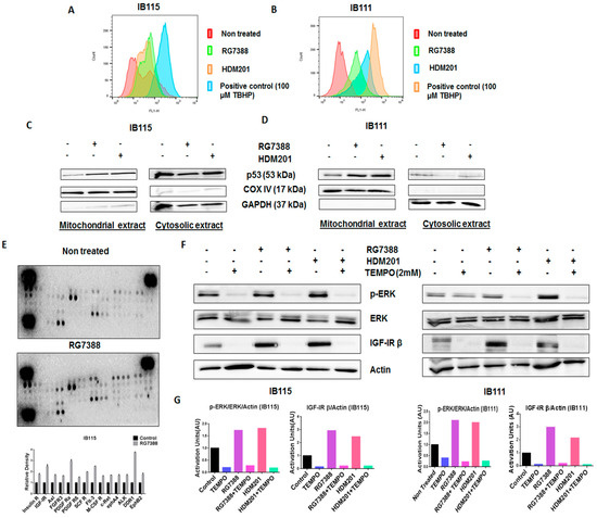The mitochondrial translocation of p53 and p53-induced production of reactive oxygen species (ROS) upon treatment with MDM2 antagonists led to the phosphorylation of ERK in DDLPS cells through the activation of receptor tyrosine kinases (RTKs). (A,B) MDM2 antagonists RG7388 and HDM201 induced generation of ROS in IB115 and IB111 cells, which were stained with DCFDA dye for 30 min at 37 °C and treated for 4 h, and the intensities of intracellular DCF were analyzed by flow cytometer. (C,D) MDM2 antagonist (RG7388 and HDM201)-induced generation of ROS is dependent on the mitochondrial translocation of p53. IB115 (C) and IB111 (D) were treated with RG7388 and HDM201 for 24 h. After 24 h, the cells were subjected to subcellular fractionation into cytosolic and mitochondrial fractions for immunoblot analysis of p53. COX IV and GAPDH were used as mitochondrial and cytosolic loading controls, respectively. (E) RG7388 treatment on IB115 cells resulted in an increased expression of Insulin R and PDGFR family RTKs through Phospho-RTK array profiling. Shown is a representative example of phosphoprotein array of control and RG7388-treated IB115 using the Proteome Profiler Human Phospho-RTK Array Kit. This platform allowed simultaneous screening of 49 different RTKs. (F) Effect of TEMPO on RG7388- and HDM201-induced phosphorylation of ERK. DDLPS IB115 and IB111 cells were treated with 2 mM TEMPO either alone or in combination with RG7388 or HDM201 for 24 h. Cells were subjected to immunoblot analysis against p-ERK, ERK, and IGF-1Rβ. Actin was used as the loading control. (G) Quantification of blots of IB115 and IB111 on treatment with TEMPO, RG7388, and HDM201 alone or in combination.