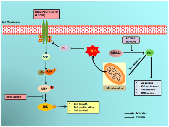 Schematic representation of MDM2 antagonist-induced phosphorylation of ERK1/2 through mitochondrial p53. MDM2 antagonists activate p53, which translocates into the mitochondria and causes elevated production of reactive oxygen species (ROS). The ROS produced inhibits the protein tyrosine phosphatases (PTPs), resulting in phosphorylation of receptor tyrosine kinases (RTKs) like PDGFR, IGF-1R, and DDR1. The activated RTKs then activate the ERK pathway.