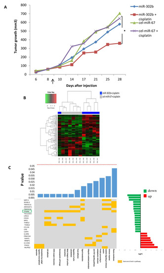 Effects of miR-302b and cisplatin treatment in an orthotopic murine triple-negative breast cancer (TNBC) model and transcriptional landscape established by miR-302b and cisplatin treatment in an in vivo assay. (A) Tumor volumes in Severe Combined Immunodeficient (SCID) mice after the peritumoral injection of miR-302b or miR-cel-67 control plus cisplatin or saline treatment evaluated across different time points. Data presented are mean values (n = 7; * p ≤ 0.05 Student’s t-test). Arrow indicates start of treatment. (B) Heatmap showing the differentially expressed genes (log fold change > 0.5 and p ≤ 0.05) in mice tumors treated with miR-302b mimic plus cisplatin versus cel-miR-67 plus cisplatin. Red or green colors represent up- or down-modulation, respectively; normalized gene expression was adjusted to y–z score. (C) Common plot showing gene enrichment analysis based on differently expressed genes. The top bar plot shows the significance of each enriched pathway. Middle panel shows the belonging of a particular gene to any of the enriched pathway (yellow mark). The right bar plot shows the log fold change values of each gene computed by the comparison of mice treated with miR-302b+cisplatin versus mice treated with cel-miR-67 negative control+cisplatin. Red or green colors represent up or down-modulation, respectively. Highlighted gene in green represent the selected candidate for further analysis.