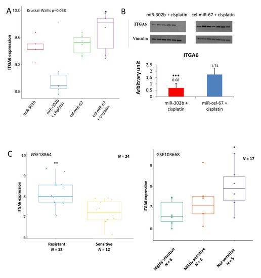 Integrin Subunit Alpha 6 (ITGA6) expression in tumor from mice treated with miR-302b mimic and cisplatin and in public data sets. (A) ITGA6 mRNA expression extrapolated from gene expression analysis in each biological group of the in vivo assay (miR-302b mimic; miR-302b mimic+cisplatin; cel-miR-67 negative control; cel-miR-67 negative control+cisplatin) (* p ≤ 0.05 miR-302b+cisplatin versus cel-miR-67 negative control+cisplatin). (B) Western blot analysis of ITGA6 protein expression in mice tumors treated with miR-302b mimic plus cisplatin and cel-miR-67 plus cisplatin. Upper figure shows specific ITGA6 bands and vinculin bands as housekeeping; lower histogram represents ITGA6 densitometric quantification (*** p ≤ 0.001). (C) Right panel shows ITGA6 expression in 24 TNBC patients treated in neoadjuvant with cisplatin (GSE18864). Left panel shows ITGA6 expression in additional 17 TNBC patients treated in neoadjuvant with cisplatin (GSE103668). (* p ≤ 0.05; ** p ≤ 0.001).