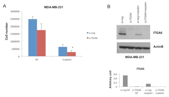 Combinatorial effect of small interfering-ITGA6 (si-ITGA6) and cisplatin in an in vitro TNBC model. (A) MDA-MB-231 cell count following si-ITGA transfection and cisplatin treatment compared with their negative controls. (B) Western blot analysis of ITGA6 protein expression in MDA-MB-231 cells transfected with si-ITGA6 and treated with cisplatin compared with their negative controls. Upper figure shows specific ITGA6 bands and β-actin bands as housekeeping; lower figure shows histograms representing ITGA6 densitometric quantification. Data are representative of three independent experiments performed at least in triplicate (* p ≤ 0.05, Student’s t-test).