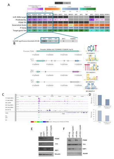 Since ITGA6 is not predicted as a putative target of miR-302b and since miRNA intervention by itself is not sufficient to significantly downregulate ITGA6 (Figure 2A), instead requiring concomitant treatment with cisplatin, we focused our attention on possible cooperative regulatory networks of ITGA6, such as transcription factors (TFs), that might be altered by miR-302b and cisplatin intervention.
