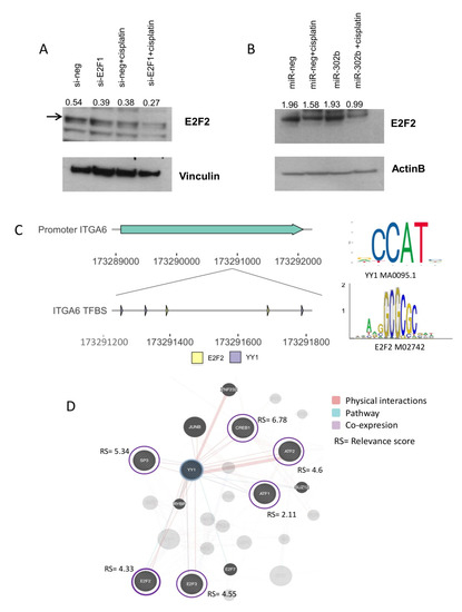 E2F2 protein expression under miR-302b plus cisplatin treatment in an in vitro model and in silico E2F2 correlation with the YY1/ITGA6 biological axis. E2F2 expression after (A) si-E2F1 knockdown and (B) miR-302b transfection in MDA-MB-231 cells treated or not with cisplatin, respectively. Vinculin and β-actin were used as housekeeping controls. Data are representative of three independent experiments performed at least in triplicate. (C) Schematic representation of robust neighbor binding sites of YY1 and E2F2 on the ITGA6 promoter. Right panel shows TFs motif from the JASPAR database used in the analysis. (D) Correlation network of YY1 and human TFs predicted to physical interact with YY1.