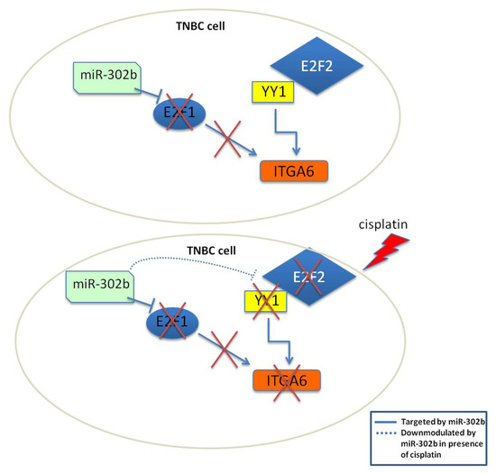 Taken together, these results suggest that the combinatorial effect of miR-302b and cisplatin on TNBC cell viability is exerted thought a mechanism involving the E2F family, YY1 and ITGA6, all molecules modulated by cisplatin activity and implicated in the response to this drug.