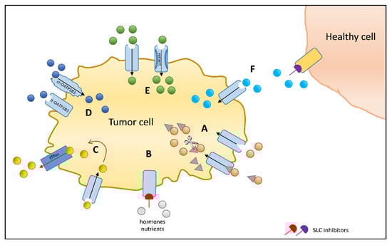Solute carrier (SLC) uptake transporters as chemotherapeutic drug targets to increase efficacy or reduce toxicity: (A) Transporter-mediated accumulation of a chemotherapeutic agent conjugated to an endogenous substrate of an SLC transporter, which may be cleaved [125] or act as a conjugate [126]. (B) SLC transporter inhibition stops the accumulation of growth promoting factors [127]. (C) Coadministration of a chemotherapeutic drug and an inhibitor of efflux transporter [128]. (D) Ct-OATP1B3-specific chemotherapeutic substrates to enhance tumor cell accumulation sparing healthy tissue expressing lt-OATP1B3 [129]. (E) Identification of genetic variants exhibiting superior transport capacity as compared to the wildtype that could allow personalized medication and dose finding [41]. (F) Inhibition of an SLC transporter in healthy tissue such as the kidney in order to reduce toxic side effects [130].