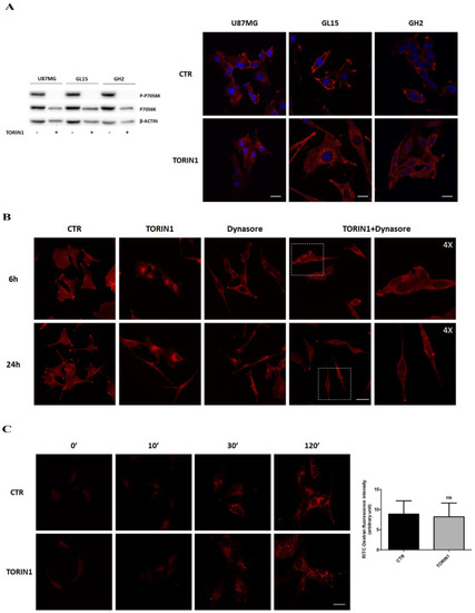 Epidermal Growth Factor receptor (EGFR) internalises into Glioblastoma multiforme (GBM) cells upon mTOR inhibition. (A) U87MG (upper panels), GL15 (middle panels) and primary GH2 cells (lower panels) were cultured in complete medium (DMEM) (CTR) or in DMEM in the presence of 250 nM Torin1 for 18 h. Immunocytochemistry and confocal analysis for EGFR localisation (red) were then performed. Hoechst 33342 was used to stain nuclei (blue). Scale bar, 30 μM. Western blot analysis of P-p70S6K and p70S6K was performed to check mTOR pathway inhibition by Torin1. β-actin was used as loading control. The blots are representative of three independent experiments. (B) Immunocytochemistry and confocal analysis for EGFR localisation (red) were performed in U87MG cells, upon 6 h and 24 h Torin1 treatment in the presence or absence of 100 μM Dynasore. Scale bar, 30 μM. A 4× magnification is shown for the right panels representing cells treated with Torin1 plus Dynasore. (C) U87MG cells were incubated with 0.5 mg/mL Rhodamine Dextran for the indicated times and its uptake within the cells analysed by image capturing at the confocal microscope. Scale bar, 30 μM. Fluorescence quantification of Dextran uptake at 120′ is shown in the right panel.