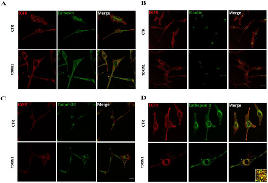 We observed that EGFR signal is largely separated from that of the endoplasmic reticulum, Golgi cisternae and mitochondria upon mTOR inhibition in U87 cells, as shown in Figure 3A–C. By contrast, a great amount of EGFR was detected in correspondence to CathepsinD-positive puncta, indicating a lysosomal delivery of the receptor 24 h after Torin1 treatment (Figure 3D). The occurrence of EGFR localisation to lysosomes upon Torin1 administration was also observed in GL15 cells and in primary GH2 cells (Figure S2). This figure indicates that, among the subcellular compartments analysed, EGFR relocalises to lysosomes upon mTOR inhibition.