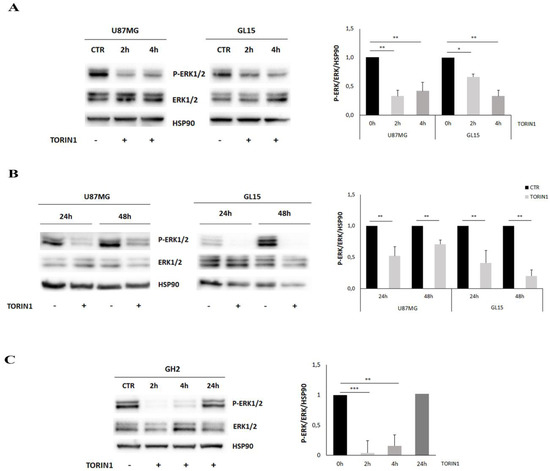 The mitogen activated protein (MAPK)/ERK pathway is down-regulated upon mTOR inhibition in GBM cells. (A,B) U87MG, GL15 were cultured in complete DMEM medium in the presence (TORIN1) or absence (CTR) of 250 nM Torin1 and analysed at 2 h and 4 h (A) and at 24 h and 48 h (B). Western blot analysis was performed by using specific antibodies for ERK1/2 and P-ERK1/2. HSP90 was used as loading control. (C) GH2 cells were cultured in complete DMEM medium in the presence (TORIN1) or absence (CTR) of 250 nM Torin1 and analysed at the indicated time points. Western blot analysis was performed by using specific antibodies for ERK1/2 and P-ERK1/2. HSP90 was used as loading control. The graph represents the mean ± SD of three different experiments. Statistical significance: * p < 0.05 Student t-test ** p < 0.01 Student t-test, *** p < 0.001 Student t-test.