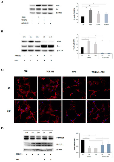 RTK endocytosis is regulated by clathrin-dependent and -independent mechanisms. It has been shown that Src kinase plays a role in regulating EGFR endocytosis by phosphorylating a clathrin heavy chain following EGF binding to its receptor [32,33]. Thus, we checked whether Src activity was involved in EGFR internalisation upon mTOR inhibition. First, we performed Western blotting analysis by using an antibody raised against the phosphorylated and active form of Src on protein extracts of U87MG incubated with EBSS, Torin1 or AZD8055, or not, for 18 h. As shown in Figure 6A, mTOR inhibition resulted in Src activation upon exposure to all the mTOR-inhibitory stimuli employed in this study. The results shown suggest that SRC activity is crucial for EGFR internalisation within the cells and for MAP/ERK pathway inhibition upon mTOR inhibition.