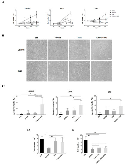 Next, we investigated whether mTOR inhibition could affect cell proliferation and viability in our GBM models. Indeed, experimental evidence indicates that mTOR inhibitors negatively affect cell proliferation and viability [34,35,36]. Cell counts were performed at 24, 48 and 72 h following Torin1 treatment and we found that cell proliferation was strongly affected starting from 24 h in all the cell lines analysed (Figure 7A,B). We also incubated cells with Temozolomide (TMZ), a drug commonly used in GBM therapy, in the presence or absence of Torin1. As shown in Figure 7A,B, TMZ impaired cell proliferation starting from 48 h of stimulation and Torin1 co-incubation slightly, but not significantly potentiated its anti-proliferative activity (Figure 7A,B). Nuclear staining with 4′,6-diamidino-2-phenylindole (DAPI) revealed that Torin1, per se, did not induce a significant increase in apoptosis up to 72 h of stimulation, similarly to TMZ alone; however, the combination of Torin1 and TMZ resulted in a significative increase in apoptotic nuclei at 72 h (from 1.5 to 16.6% in U87MG; from 0.9 to 8.5% in GL15; from 0.6 to 9.1% in GH2) (Figure 7C). In order to correlate the effects on cell proliferation with EGFR internalisation, we also performed cell counting experiments in Torin1-stimulated cells in the presence of the SRC inhibitor PP2 or of the endocytosis inhibitor Dynasore. We observed that pre-incubation with both PP2 and Dynasore partially prevented Torin1-induced arrest of cell proliferation, although Dynasore negatively impacted, per se, cell proliferation (Figure 7D,E). Taken together, these results indicate that mTOR inhibition negatively affects cell proliferation and this effect is dependent on EGFR internalisation within the cell. Moreover, mTOR inhibition potentiates the ability of TMZ to induce apoptosis.