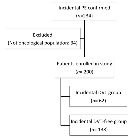 VTE is the main manifestation of the hypercoagulability state associated with cancer and is a leading cause of mortality and morbidity in patients with malignancies [17,18,19]. Several studies have reported the rate of an incidental diagnosis of PE in patients with cancer, with an incidence rate of unsuspected PE of 4 to 9% [20,21,22]. A meta-analysis of five studies involving patients with cancer calculated a weighted mean prevalence of unsuspected PE of 3.1% [23]. Nevertheless, few studies have focused on the prognostic effect of incidental concomitant DVT in patients with cancer and incidental PE [24,25,26]. In 2019, an observational, international, and prospective study assessed current treatment strategies for incidental PE in 695 patients with cancer [24]. This study did not provide data on the number of patients with incidental PE with associated DVT. In 2020, Mulder et al. published a post-hoc analysis of the Hokusai VTE-Cancer Clinical Trial [25], which analyzed 1046 patients with cancer and VTE, of whom 32% had incidental VTE [26]. Of them, 87.6% (n = 290) had PE with or without DVT. However, it was not possible to determine how many patients had concomitant incidental DVT.