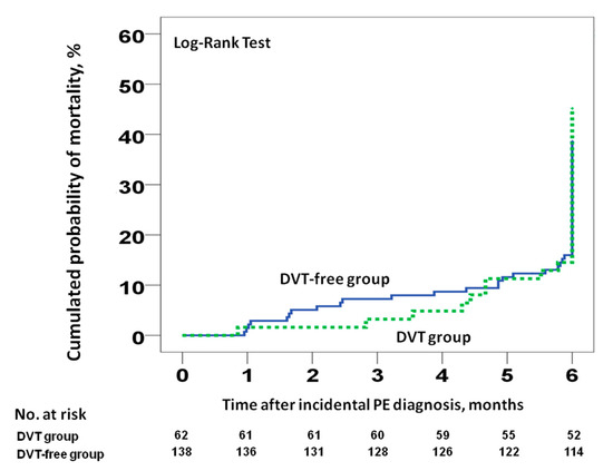 Several recent studies have assessed the prognostic effect of concomitant DVT in patients with acute PE [8,9,16,29]. One study, involving 2442 patients registered in the ICOPER (International Cooperative Pulmonary Embolism Registry) who had acute PE, did not observe an association between the presence of DVT and all-cause mortality [3]. Girad et al. observed that concomitant DVT was not associated with the risk of death at three months [9]. However, a study involving 707 patients with acute PE and concomitant DVT reported higher cumulative mortality than that observed in patients without DVT [8]. In a smaller study of 296 patients with symptomatic acute PE, Wicki et al. showed that the presence of concomitant DVT was associated with a higher mortality risk [29]. Becattini et al. performed a meta-analysis of studies that enrolled patients with acute PE to assess the prognostic value of concomitant DVT in terms of primary (30-day all-cause mortality) and secondary outcomes (90-day PE-related adverse events) [16]. They found that of the 8859 patients enrolled from across nine studies, 56% had concomitant DVT. Concomitant DVT was significantly associated with 30-day all-cause mortality (OR 1.9, 95% CI 1.5–2.4), although no association was found with 90-day PE-related adverse outcomes. These studies of patients with symptomatic acute PE analyzed all-cause mortality at 30 or 90 days. Meanwhile, our study is the first to analyze the effect of incidental DVT in patients with incidental PE, and we proposed all-cause mortality at six months (as the primary outcome) and at 30 and 90 days. However, we found no association between the presence of DVT and all-cause mortality in any of the analyses performed.
