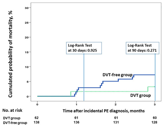 Quantitative variables were expressed as means ± standard deviations. Medians and interquartile ranges (IQR) were used for non-normally distributed continuous data, and numbers and proportions for categorical data. We calculated Kaplan–Meier probabilities to estimate time to death and time to VTE recurrence, and a log-rank test was performed to assess differences between the groups. We censored for loss to follow-up (none) and study completion in the survival analyses. In addition, we controlled VTE recurrence models censored for death. To evaluate the association between concomitant DVT at the time of PE presentation, we performed a Cox proportional hazard regression analysis. In the full model, we included variables with a potential prognostic role in addition to the presence of incidental DVT. Backward stepwise regression was carried out to obtain the adjusted final model, with the variables selected in the equation in the last step. For all analyses, statistical significance was defined at a p-value of <0.05. The 95% CI was calculated using the Clopper–Pearson exact method. Binomial distribution using Statistical Package for the Social Sciences (SPSS) Statistics version 20.0 (IBM, Chicago, IL, USA) was employed, and all statistical analyses were performed using IBM SPSS Statistics version 24.0 software.