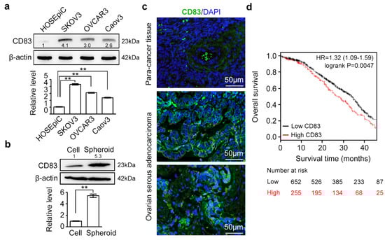 CD83 was ectopically activated in ovarian cancer cells/tissues, and its high expression predicted decreased survival rates. (a) Protein level of CD83 in human ovarian surface epithelial cell HOSEpiC and various ovarian serous adenocarcinoma cell lines (e.g., SKOV3, OVCAR3, and Caov3). PNGase F (NEB P0704S) was utilized to remove all N-linked oligosaccharides from glycoproteins. (b) The protein level of CD83 in SKOV3 cells and SKOV3 single cell-derived spheroids. The data in a and b were presented as the mean±SEM; Student’s t-test; ** p < 0.01. (c) Expression and membrane distribution of CD83 (Abcam, ab205343) in ovarian serous adenocarcinoma and para-cancer tissue samples (OriGene, CT565862) were revealed by immunofluorescent staining. Scale bar, 50 μm. (d) Kaplan–Meier analysis of overall survival based on CD83 levels in 907 ovarian cancer patients (low CD83 expression: 652, the high expression: 255) from the The Cancer Genome Atlas (TCGA) database. High expression of CD83 was closely relative to the reduced overall survival rates (p = 0.0047). The uncropped western blots of Figure 1a,b in the Figures S8 and S9.