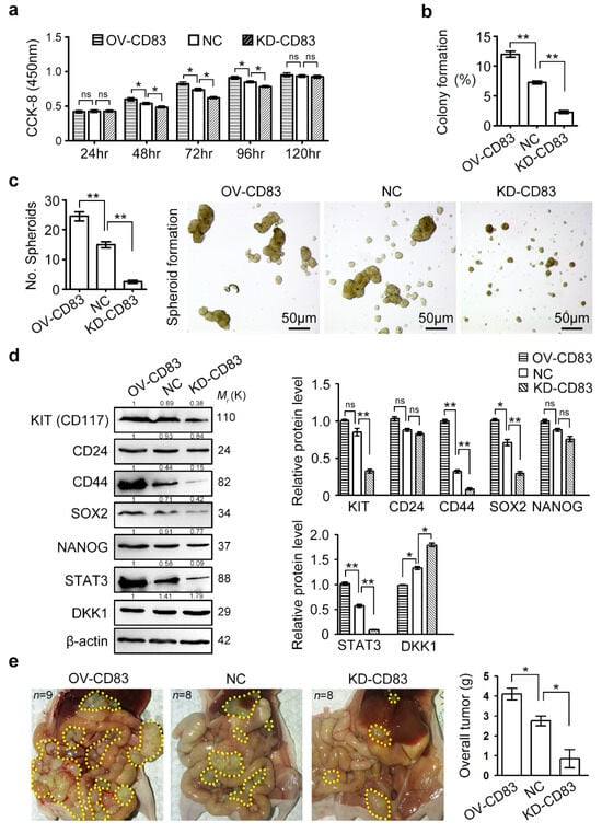 CD83 promoted growth proliferation, spheroid formation, and in vivo tumor growth of ovarian cancer cells. (a) SKOV3 cell proliferation was significantly attenuated by CD83 knockdown, whereas CD83 overexpression significantly stimulated the proliferation, as revealed by Cell Counting Kit-8 (CCK-8) assay. (b) Colony formation of SKOV3 cells (500 cells per 60 mm dish) was significantly promoted by enforced expression of CD83. (c) The number of spheroids derived from SKOV3 cells, which are cultured onto ultra-low attachment plates in cancer stem cell culture medium. Scale bar, 50 μm. (d) Expression of stemness factors, STAT3, and DKK1 identified by Western blotting. The uncropped western blots of Figure 2d in the Figure S10. (e) Intraperitoneal injection of SKOV3 cells (1 × 106) into nude mice. The total tumor weights for CD83-OV groups (n = 9) were significantly higher than that for the control groups (n = 8) and CD83-KD groups (n = 8). The differences between NC and OV, as well as NC and KD, were presented as the mean±SEM; Student’s t-test; * p < 0.05, ** p < 0.01, ‘ns’ means not significant.