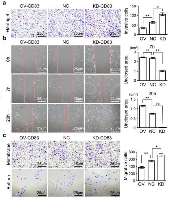 CD83 inhibited the invasion and migration of ovarian cancer cells. (a) Representative images and quantification of invasive SKOV3 cells in OV-CD83, NC, and KD-CD83 transwells using matrigel invasion assay. Scale bar, 25 μm. (b) The migration ability of SKOV3 cells was determined by wound-healing assay, and the closed wound area was calculated at 0, 7, and 20 h. (c) Representative images and quantification of migrative cells using a transwell migration assay. Scale bar, 25 μm. The differences between NC and OV, as well as NC and KD, were presented as the mean ± SEM; Student’s t-test; * p < 0.05, ** p < 0.01, ‘ns’ means not significant.