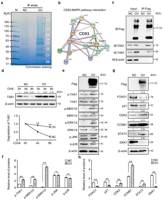 To dissect the molecular mechanisms of CD83 in the fate determination of ovarian cancer cells, we used the immunoprecipitation, followed by mass spectrometry (IP-MS) approach, to identify protein candidates that functionally associate with transmembrane CD83 (Figure 5a). The details of IP-MS identification are illustrated in Table S5. Notably, several components of mitogen-activated protein kinase (MAPK) family, such as mitogen-activated protein kinase kinase kinase 7 (MAP3K7) (also known as TAK1), TGF-beta activated kinase 1 (MAP3K7) binding proteins (TAB1, TAB2, and TAB3), MAP2K4, MAPK1, MAP2K2, and MAP2K3, were identified in CD83 pull-down complexes as the main fraction (Figure 5b). MAPK signaling pathway acts as an integration point for multiple biochemical signals, involving in a wide variety of cellular processes, such as proliferation and differentiation []. MAP3K7 (TAK1), a MAPKKK, forms a kinase complex, including TAB1, TAB2, and TAB3, to active downstream MAP2K4 and MAPK8 []. Given that TAK1 and TAB1 are preassociated on the cell membrane, as well as the membrane localization of CD83, we hypothesized that CD83 forms a complex with TAK1-TAB1 to activate the MAPK signaling pathway. We explored the nature of the interaction between CD83 and TAK1-TAB1 in SKOV3 cells by co-immunoprecipitation (Co-IP) experiments and confirmed the CD83-TAK1 and CD83-TAB1 interactions (Figure 5c). Interestingly, CD83 further promoted the stability of TAB1 when SKOV3 cells were treated by cycloheximide, a protein synthesis inhibitor (Figure 5d). Upon CD83 overexpression in SKOV3 cells, the protein levels of phosphorylated (p-)TAK1, p-MEK1/2, and p-ERK1/2 were significantly increased, whereas their total levels remained unchanged, indicating the activation of a MAPK-MEK-ERK signaling pathway (Figure 5e,f). As known, the p-ERK1/2-FOXO1-p21 signaling pathway controls the cyclins/CDKs-mediated cancer cell proliferation [,,], and the STAT3-DKK1 signaling pathway regulates spheroid formation of ovarian cancer cells []. Next, we examined the involvement of p-ERK1/2-FOXO1-p21 and STAT3-DKK1 signaling pathways in the regulation of proliferation and stemness of ovarian cancer cells by the newly-identified CD83-TAK1-TAB1 complex. In CD83-OV SKOV3 cells, the expression of the transcription factor FOXO1 and cell cycle progression inhibitor p21 was significantly attenuated, whereas CDK2 and cyclin B1 levels were elevated as compared with that in control groups (Figure 5g,h). On the other hand, the elevated STAT3 expression and downregulation of DKK1 were observed in CD83-OV SKOV3 cells as compared with control groups (Figure 5g,h). Taken together, these data suggested that CD83 formed a complex with TAK1-TAB1 on the cell membrane to further activate downstream p-ERK1/2-FOXO1-p21-CDK2 and STAT3-DKK1 signaling pathways in ovarian cancer cells.