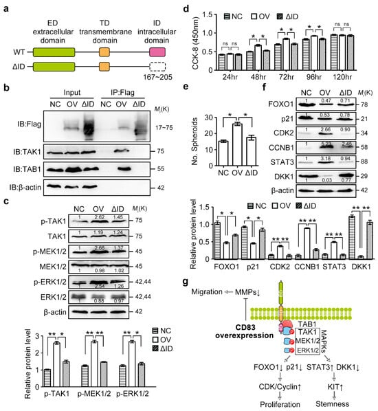 Next, we identified the region within CD83 to mediate the interaction between CD83 and TAK1-TAB1 complex. Membrane CD83 protein contained an extracellular domain, a transmembrane domain, and an intracellular domain (residues 167–205) (Figure 6a). We generated a truncation mutant of the CD83 intracellular domain (termed CD83ΔID) with a Flag tag and found that the deletion of the intracellular domain significantly blocked the interaction of CD83 with TAK1 and TAB1 in a Co-IP assay (Figure 6b). As expected, SKOV3 cells transfected with CD83ΔID expressed a lower level of p-TAK1, p-MEK1/2, and p-ERK1/2 as compared with those in the wild-type CD83-transfected SKOV3 cells (Figure 6c). Importantly, CD83-mediated stimulation of cell proliferation and spheroid formation was significantly inhibited in CD83ΔID-transfected SKOV3 cells (Figure 6d,e). Moreover, the deletion of the intracellular domain interrupted the stimulations of CDK2, CCNB1, and STAT3, as well as inhibitions of FOXO1, p21, and DKK1 by CD83 (Figure 6f). Taken together, our findings demonstrated that the CD83 intracellular domain was important for its association with TAK1/TAB1 and activation of the MAPK signaling pathway, as well as CD83 function in ovarian cancer cells.