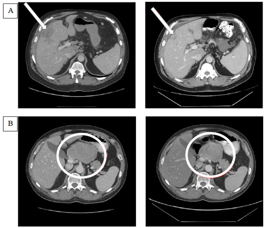 Examples of tumor responses after glembatumumab vedotin treatment. (A) The computerized tomography (CT) scan on the left indicates the baseline target lesion in the liver parenchyma that is pointed at by an arrow. The CT scan image on the right demonstrates the shrinkage in the target lesion after glembatumumab vedotin (GV). (B) The CT scan on the left demonstrates the target lesion in the porta hepatis lymph node, and the one on the right shows the changes in the lesion after GV. Though the lesion appears to have shrunk in size, the decrease in the lesion’s short axis was not sufficient to meet the response criteria of RECIST 1.1. The target lesion response in the right panel was classified as a stable disease.