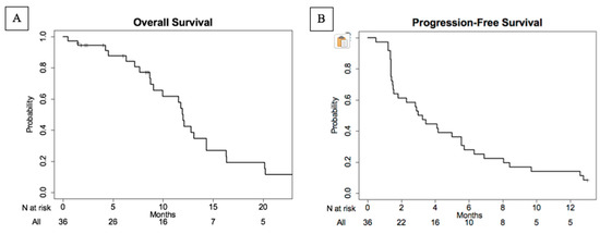 Kaplan–Meier plots of overall survival (A) and progression-free survival (B) in evaluable patient population. The median overall survival was 11.9 months (95% CI: 9.0–16.9) ranging between 0.5 and 40.2 months. The median progression-free survival (PFS) was 3.1 months (95% CI: 1.5–5.6) and ranged between 0.5 and 30.5 months.
