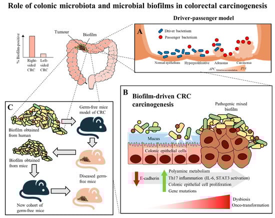 The role of colonic microbiota and biofilm in colorectal cancer (CRC) carcinogenesis. (A) The driver-passenger model for CRC carcinogenesis [39]. (B) Biofilm-driven CRC carcinogenesis. Biofilm results in loss of colonic epithelial cell E-cadherin (consistent with disrupted intestinal barrier function), increased IL-6 expression and STAT3 activation. These microbial biofilms contribute to a pro-oncogenic and pro-inflammatory state, coupled with the increased polyamine metabolism in colonic tissues, hence resulting in dysbiosis and onco-transformation and leading to tumor progression [11]. (C) The reassociation experiment showing that the microbiota communities from human biofilm-positive mucosa (healthy or CRC patients) resulted in CRC development in a new cohort of mice, indicates these biofilm-positive microbiota communities maintained their tumorigenic capacity [6].