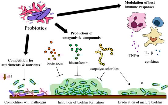 Probiotics have been identified to hinder biofilm formation and the survival of biofilm pathogens with different mechanisms. Some of these mechanisms include (a) the production of antagonistic compounds, (b) competition with pathogens and (d) modulation of host immune responses [118] (Figure 2). Probiotics can produce various antagonistic compounds, including exopolysaccharides [119], bacteriocins [120] and biosurfactants [121] which exhibit antibiofilm activity. These antagonistic compounds have been shown to interfere with biofilm attachment and formation as well as the thinning of mature biofilms. Furthermore, probiotics are capable of competing with the pathogenic bacteria for surface of attachment and nutrients by altering their surrounding pH values [122,123]. Besides the direct interactions between probiotics and the pathogens, probiotics exert immunomodulatory effects via interaction with the immune system when administered into a host. Studies suggest that probiotics and their soluble factors can regulate and activate specific immune cells and the release of cytokines via toll-like receptor recognition to elicit immunomodulatory effects [124,125].