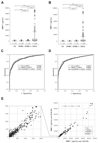 Matrix metalloproteinase-1 (MMP-1) levels in saliva from 1160 clinical specimens. (A,B) Salivary levels of MMP-1 in healthy controls, oral potentially malignant disorders (OPMD) I, OPMD II, and oral squamous cell carcinoma (OSCC) patients were determined using two pairs of enzyme-linked immunosorbent assays (ELISAs), pair A (A) and B (B), as described in Section 2. ** p < 0.01. *** p < 0.001. (C,D) Receiver operating characteristic (ROC) curve showing the diagnostic efficacy of salivary MMP-1, determined using pair-A ELISA (C) and pair-B ELISA (D) for OSCC versus non-cancerous groups (healthy controls (HC) and OPMD). (E) Correlation between levels of salivary MMP-1 in HC, OPMD I, OPMD II, and OSCC patients, determined using pair A- and pair B-ELISA, as described in Section 2 (Pearson correlation, r = 0.957, p < 0.001). The boxed image in the right panel is enlarged and shown on the left.
