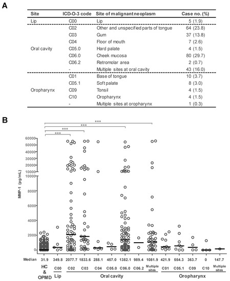 Differential expression levels of salivary MMP-1 in OSCC and non-cancerous groups. (A) Clinical information and subgroups of OSCC (n = 269) in this study. (B) Associations between salivary MMP-1 content in HC, OPMD, and OSCC with different tumor sites. *** p < 0.001. The median level of salivary MMP-1 (pg/mL) in each subgroup is shown for comparison.