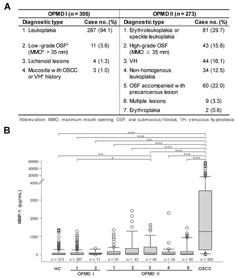 Differential expression levels of salivary MMP-1 in OPMD I and OPMD II. (A) Diagnostic types of OPMD I and OPMD II cases in this study. (B) Associations between salivary MMP-1 content in HC, different types (case no. > 10) of non-cancerous OPMD I and OPMD II, and OSCC. * p < 0.05, ** p < 0.01. *** p < 0.001.