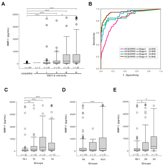 Differential expression levels of salivary MMP-1 in oral cavity cancer patients with advanced stages and grades. (A) Associations between salivary MMP-1 content in HC, OPMD, and different stages (0, I, II, III, and IV) of oral cavity cancer. * p < 0.05, ** p < 0.01, *** p < 0.001. (B) ROC curve showing the diagnostic efficacy of salivary MMP-1 for different stages (I–IV) of oral cavity cancer versus non-cancerous groups (HC and OPMD). (C–E) Associations between salivary MMP-1 content in oral cavity cancer specimens with tumor size (pT status, T0–T4) (C), neck lymph node metastasis (pN status, N0–N3) (D), and grade (G0–G3) (E).