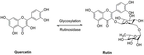 Rutin, also known as rutoside, quercetin-3-O-rutinoside and sophorin, is a glycoside consisting of the flavonol quercetin and the disaccharide rutinose. Rutin has also been called vitamin P, as it is widely distributed in various plants, from vegetables and fruits to medicinal plants, including asparagus, buckwheat, apricots, apples, cherries, grapes, grapefruit, plums, oranges, and tea. Rutin has shown ubiquitous pharmacological properties, including antioxidant, anti-inflammatory, antiangiogenic, pro-apoptotic, and antiproliferative activities, all of which may participate in the prevention and treatment of cancer [28,29,30,31,32,33,34]. Figure 1 displays the chemical structure of rutin and its reversible deglycosylation to produce quercetin. Amongst previous reviews, Prasad et al. [35] and Ganeshpurkar et al. [36] described the pharmacological activities of rutin in combating several diseases, with very limited information related to cancer studies. In another study, Perk et al. [37] reviewed the anticancer effect of rutin without a specific focus on cancer types. A comprehensive and critical analysis of the anticancer effects of rutin and associated molecular targets amongst various cancer types has not been performed before. Therefore, the purpose of this review is to present an up-to-date and critical evaluation of multiple cellular and molecular mechanisms through which the anticancer effects of rutin are known to be exerted. The current challenges and limitations, as well as future directions of research, are also discussed.