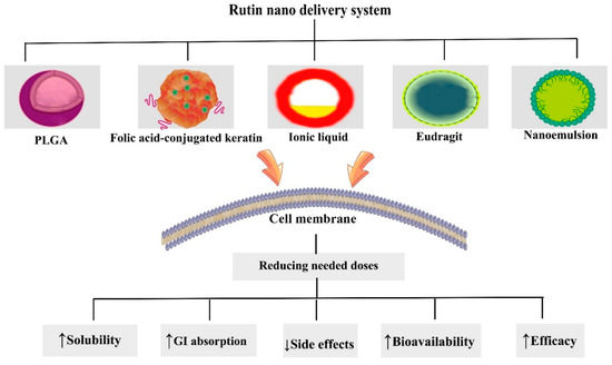 Overall, experimental results demonstrate that the properties of nano drug delivery systems have been able to overcome pharmacokinetic limitations of rutin, underscoring its promising effects in chemotherapy. Further research needs to be performed to design surface-modified nanoformulations of rutin to attain optimized drug delivery systems. Various novel drug delivery systems of rutin and their effects on improving pharmacokinetic limitations are depicted in Figure 3.